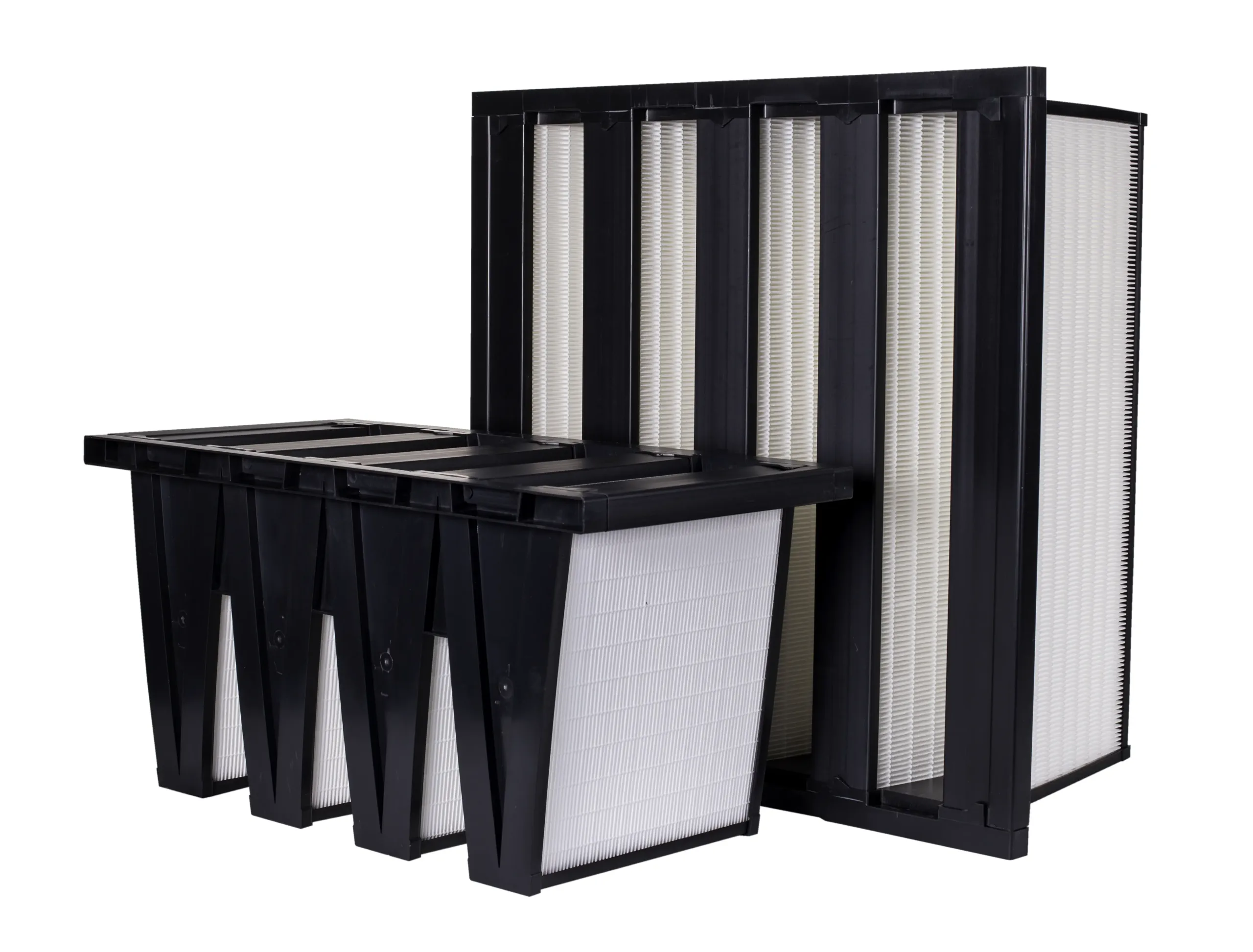 Safe Air W Module HEPA Filters are suitable for hospitals, pharmaceutical production, food processing, cleanrooms, and labs. The V-module structure captures 99.97% of microscopic particles, ensuring safety and hygiene.